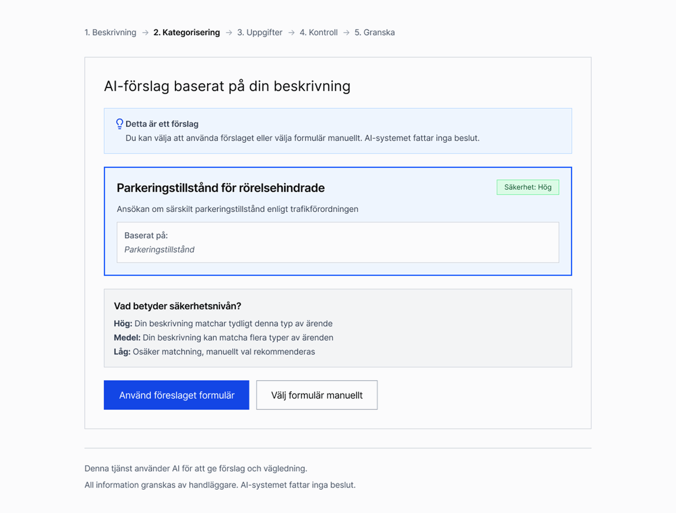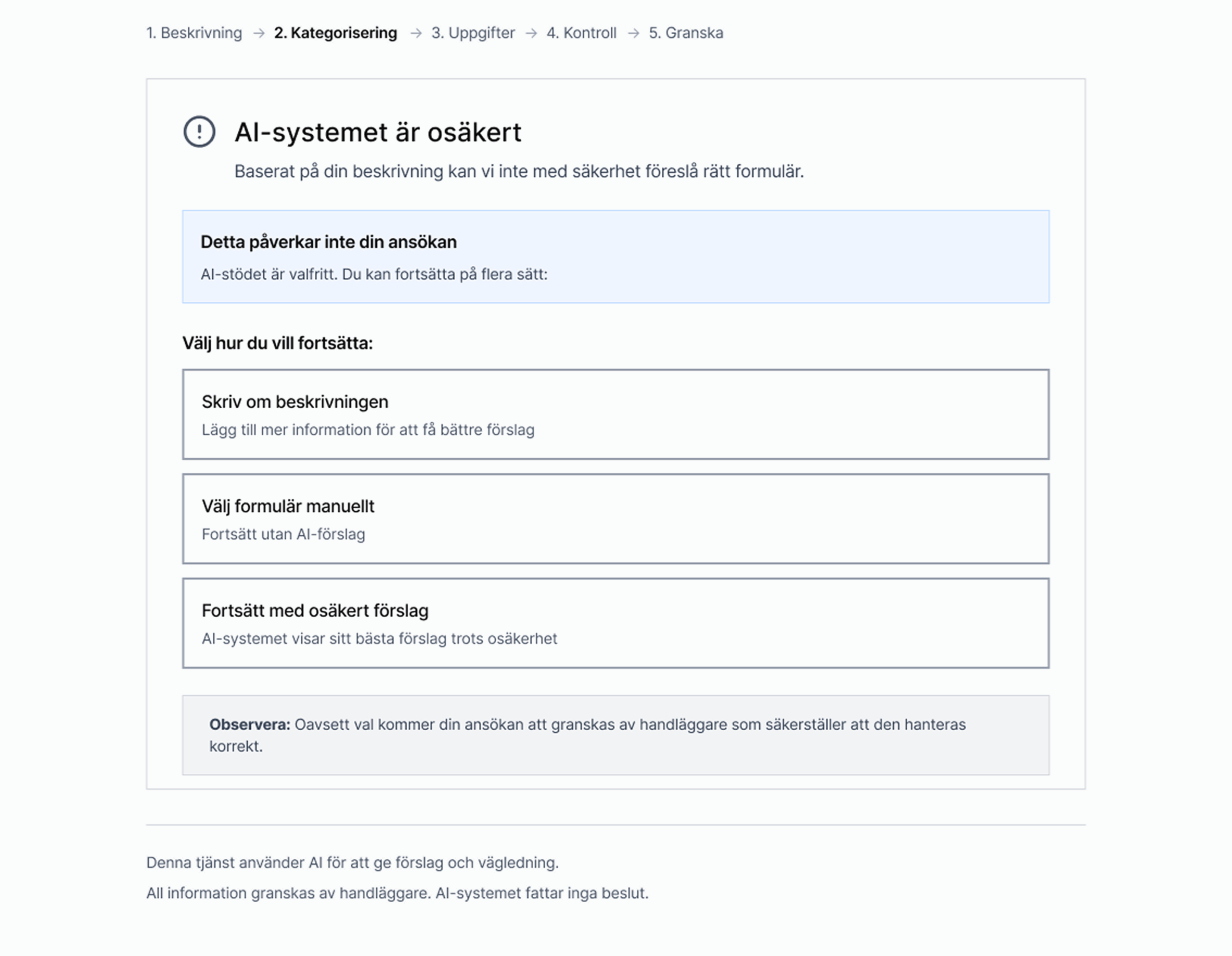 The project resulted in a concrete interaction model for how AI can be integrated into forms without replacing user control or responsibility. The solution clarifies the division of responsibility between users, AI, and systems, which reduces the risk of overconfidence and misinterpretation. The flow reduces cognitive load through progressive division and contextual AI assistance rather than generic instructions.